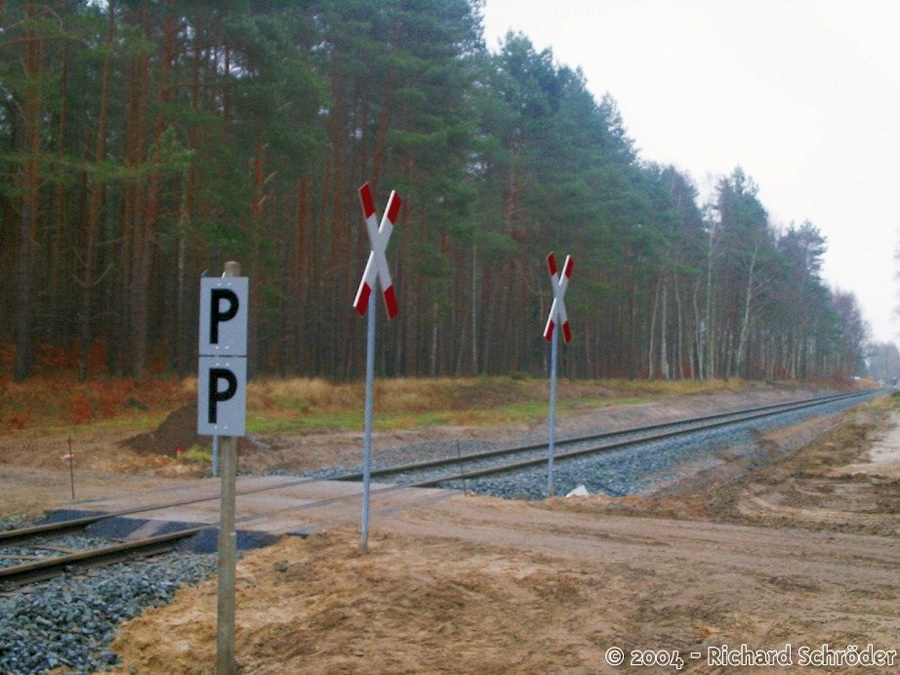 Wenige Wochen nach dem ersten Bild präsentiert sich der Überweg bereits ganz anders. Die Andreaskreuze stehen noch, die Gleise sind aber verschwunden. Statt dessen liegt nun das alte Hauptsignal sowie das Vorsignal zur Abholung bereit. Diese waren bereits vorher durch Vandalismus zerstört worden und daher nicht mehr in Betrieb.
