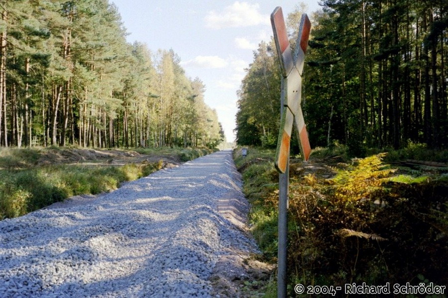 Beschreibung: Der Bahnübergang an der Meyers-Hausstellen-Schneise liegt zwischen den Ortschaften Wiethagen und Gelbensande kurz hinter dem Ortsausgang Wiethagen. Früher befand sich hinter dem Überweg ein Übungsgelände der Nationalen Volksarmee, so dass davon ausgegangen werden kann, dass dieser Weg auch durch Fahrzeuge rege genutzt worden ist. Dennoch blieb die Sicherung einfach gehalten. |